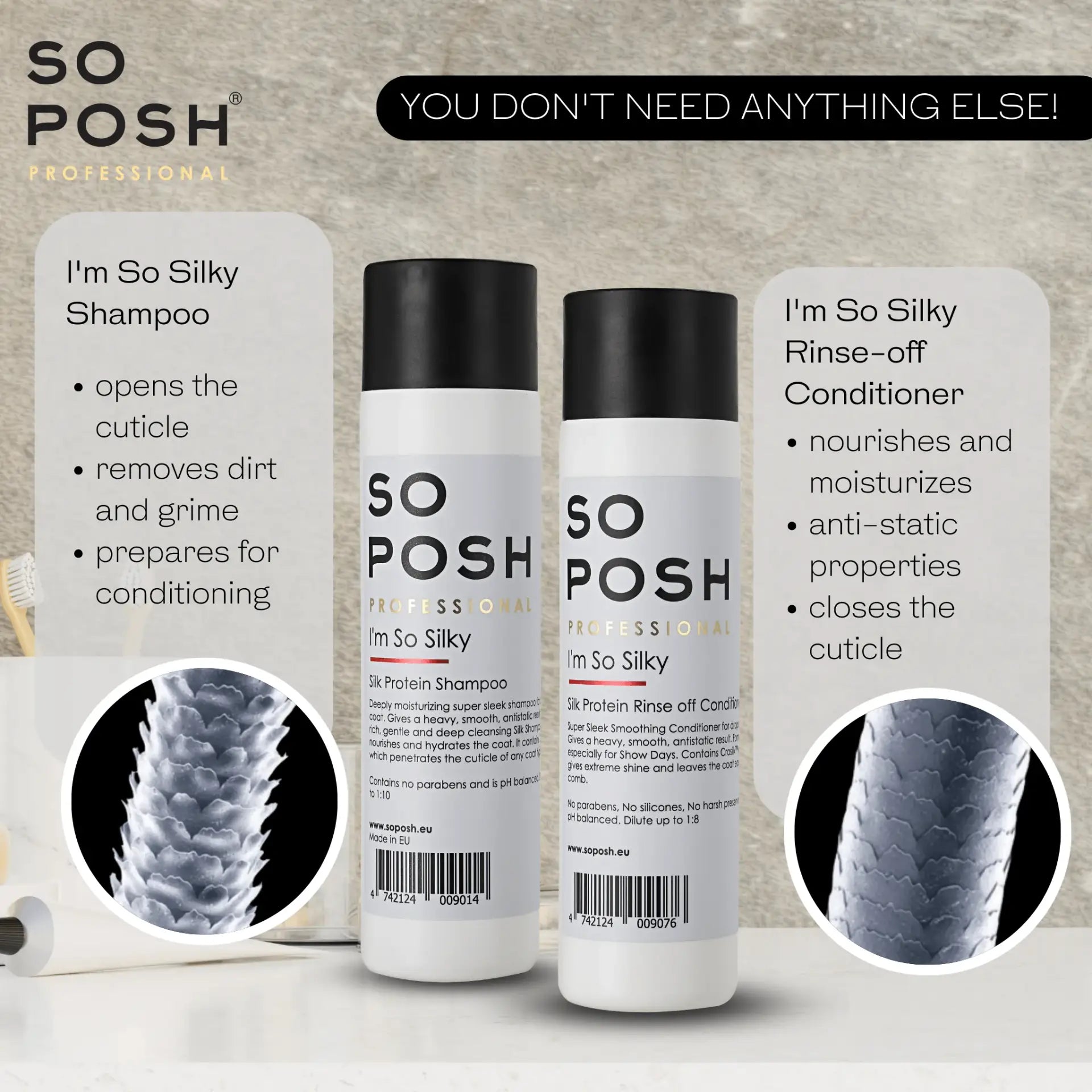 Introducing I'm So Silky Shampoo – the ultimate solution for a shiny, tangle-free coat. Formulated for drop-coats, this deep-cleansing shampoo is enriched with silk protein and Crosilk™ to hydrate, soften, and improve manageability, leaving your pup's coat silky smooth and easy to brush. Free from harsh preservatives, SLS, and parabens, it’s safe for your pet and ideal for professional use. The 1:10 concentrate formula means a little goes a long way. Perfect for silky-coated breeds like Yorkies, Maltese, and Afghan Hounds, it rejuvenates hair growth and keeps coats looking lush and healthy. Say goodbye to tangles and brittle fur with I'm So Silky Shampoo!